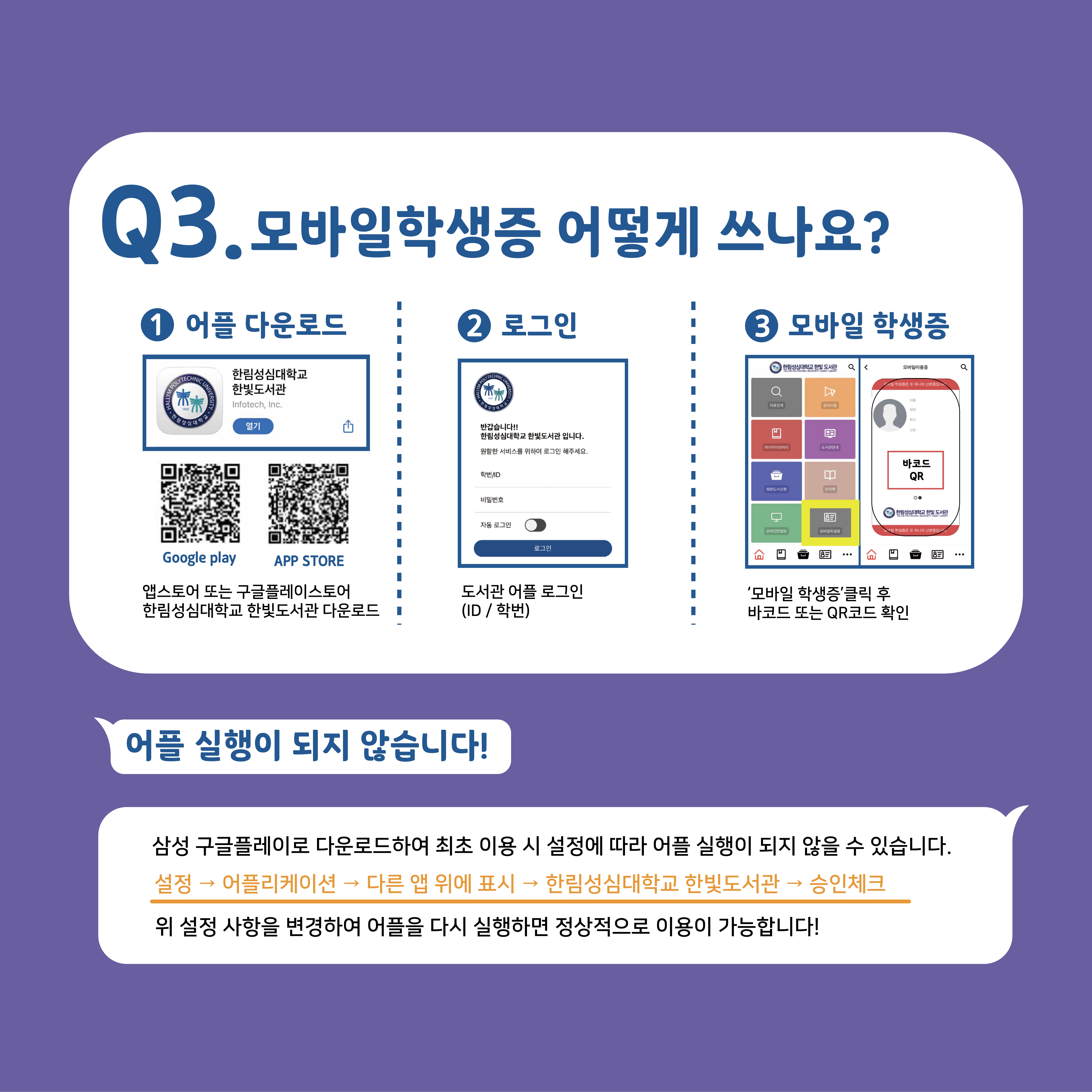- 도서관 앱 다운로드 → 로그인(ID/학번) → QR코드 확인