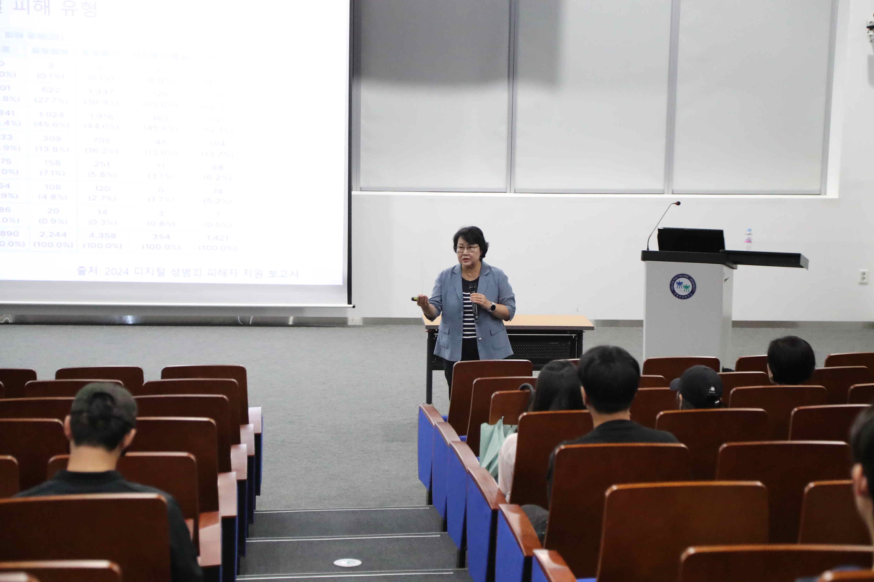 이번 특강은 AI를 사용한 딥페이크 및 몸캠피싱 등 현재 사회에 대두되고 있는 디지털 성범죄를 이해하고 예방하기 위한 목적으로 진행되었으며, 강의는 한국양성평등교육진흥원 백성숙 강사가 맡았다.